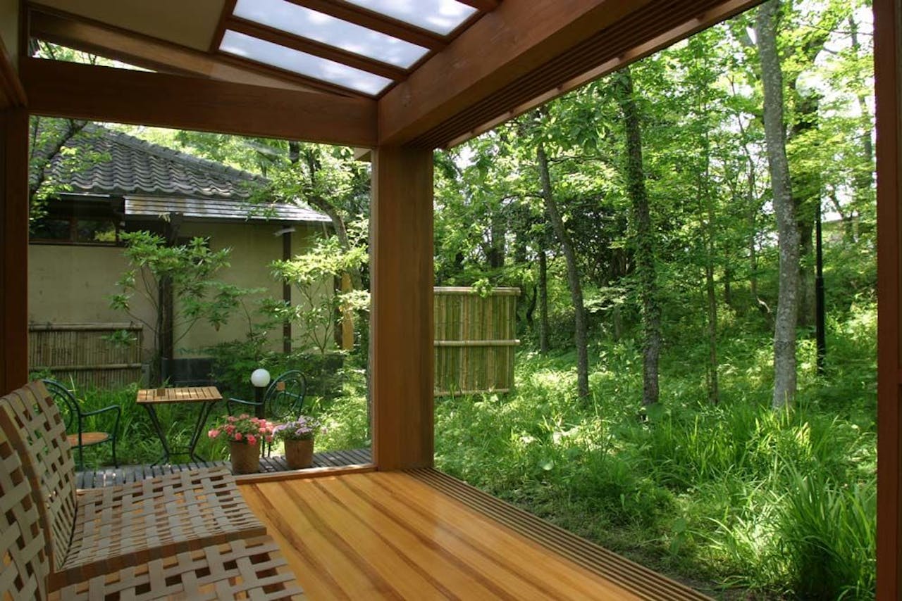 約3,000坪の広々とした敷地にわずか17室の離れの客室が点在しています。全室に温泉かけ流しの木造りの内風呂があり、目の前に広がる森林の香りやざわめきを楽しみながら温泉に浸かることができます。